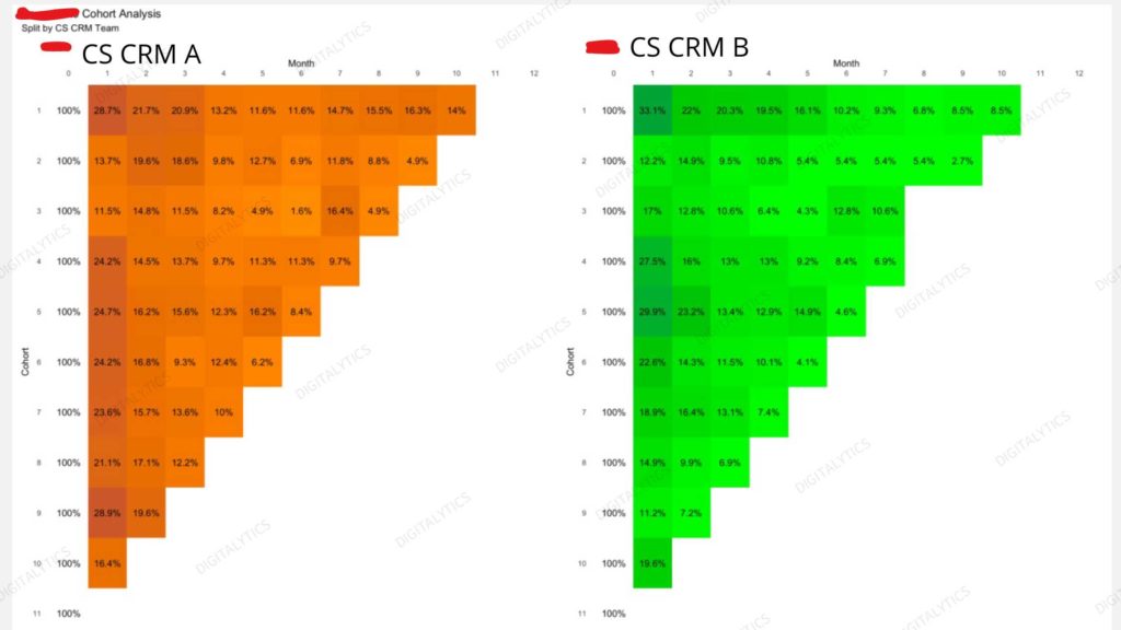 Sebagai ilustrasi, sebuah perusahaan SaaS mungkin menggunakan analisis kohort untuk mengidentifikasi bahwa pengguna yang mengikuti program orientasi lengkap memiliki retensi yang lebih tinggi dibanding yang tidak. Dengan informasi ini, perusahaan dapat memutuskan untuk memberikan insentif atau lebih banyak sumber daya bagi pengguna agar menyelesaikan proses orientasi. Selain itu, perusahaan dapat mengamati kohort berdasarkan karakteristik demografis atau perilaku, sehingga memungkinkan perusahaan tersebut untuk merancang strategi CRM yang efektif yang mengatasi kebutuhan spesifik setiap kelompok.
