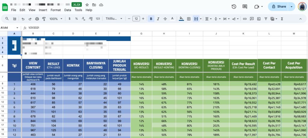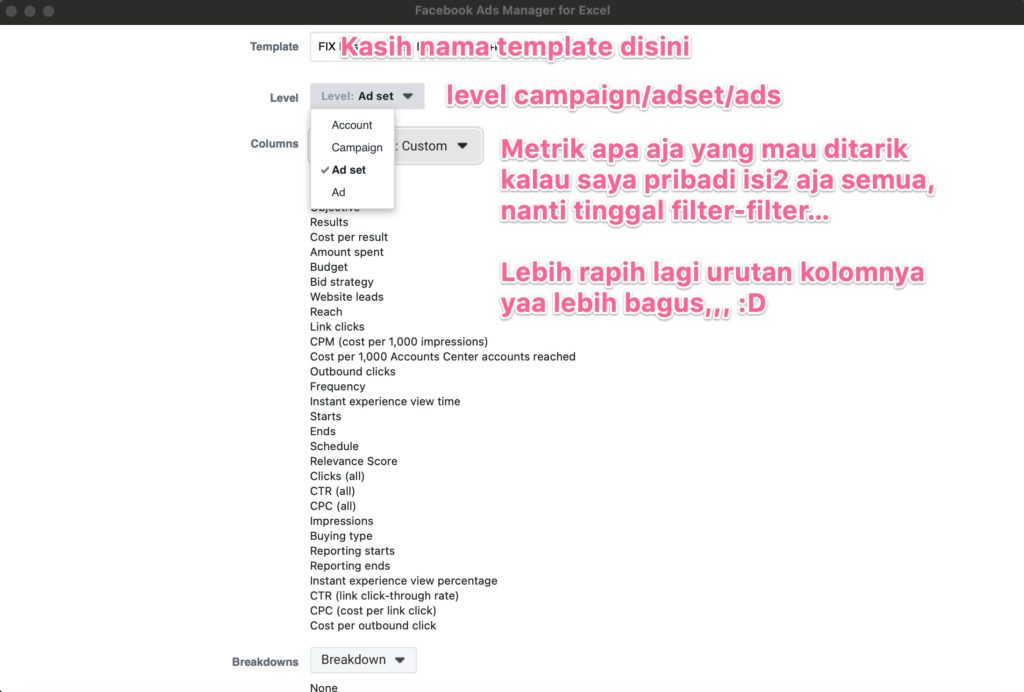 - Sangat saya sarankan buat template dulu, apa-apa aja metrik yang mau ditarik, dan urutan metriknya juga akan lebih rapih setiap narik day by day nya, jadi gak setting-setting ulang dan biar seragam juga kolom-kolomnya
